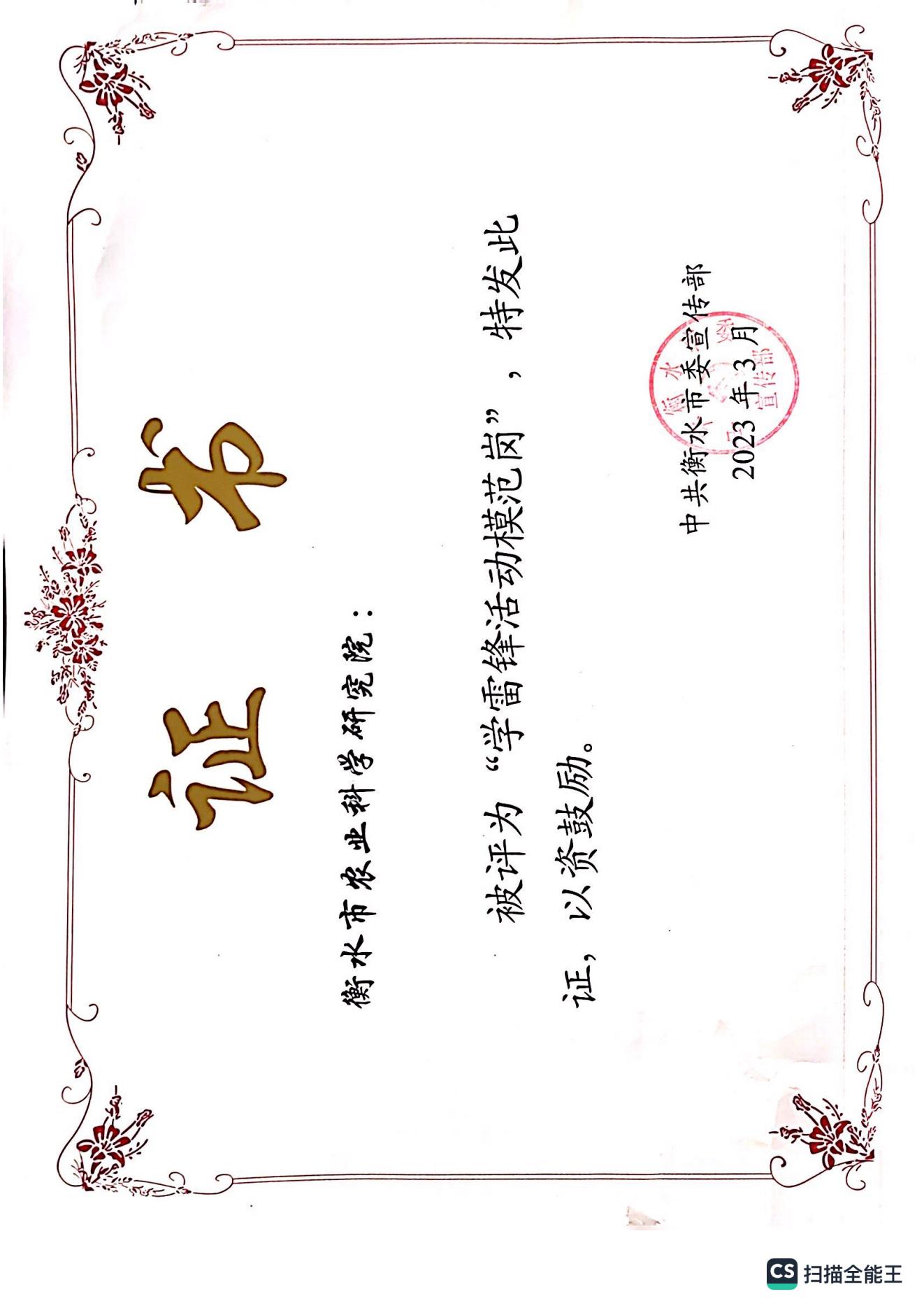 旱作所被衡水市評為學雷鋒活動模范崗