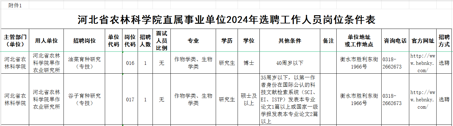 | 附件1:河北省農林科學院直屬事業(yè)單位2024選聘工作人員崗位條件表 |
